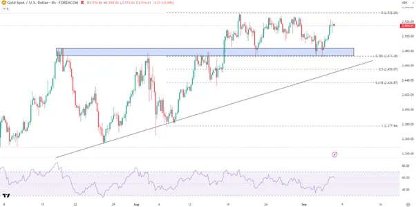 符合预期或更为强劲的就业报告或令金价承压并再次下探2470/80的关键支撑区域。反之,若非农不佳将剧衰退风险,激进的降息预期和避险情绪或帮助黄金再次冲击新高。