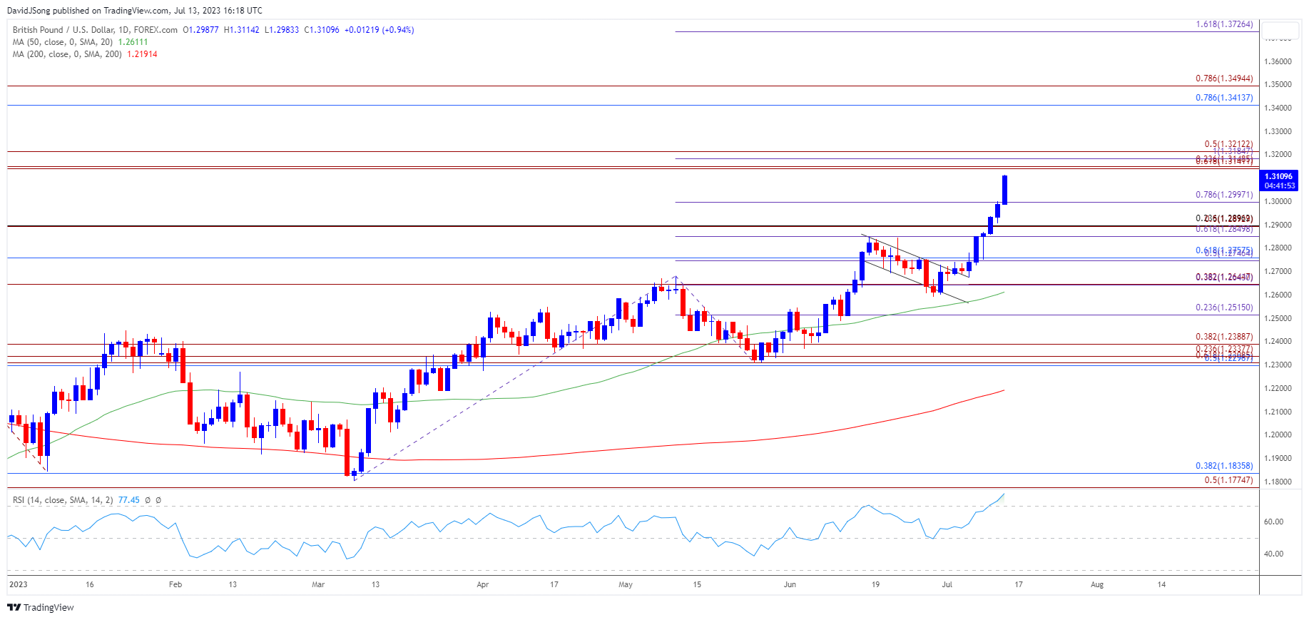 - 随着英镑/美元突破6月高点(1.2848),看涨旗形逐渐成形,汇率上涨在2023年首次将相对强弱指数(RSI)推向超买区域。