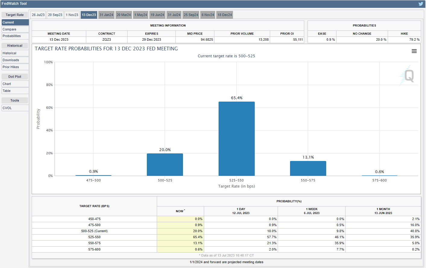 然而,CME FedWatch Tool显示市场对美联储政策潜在变化的猜测越来越多, 12月基准利率达到5.25%至5.50%的可能性超过80%,而美元可能在6月26日FOMC决议之前陷入不利局面,因为央行看来已接近加息周期的尾声。